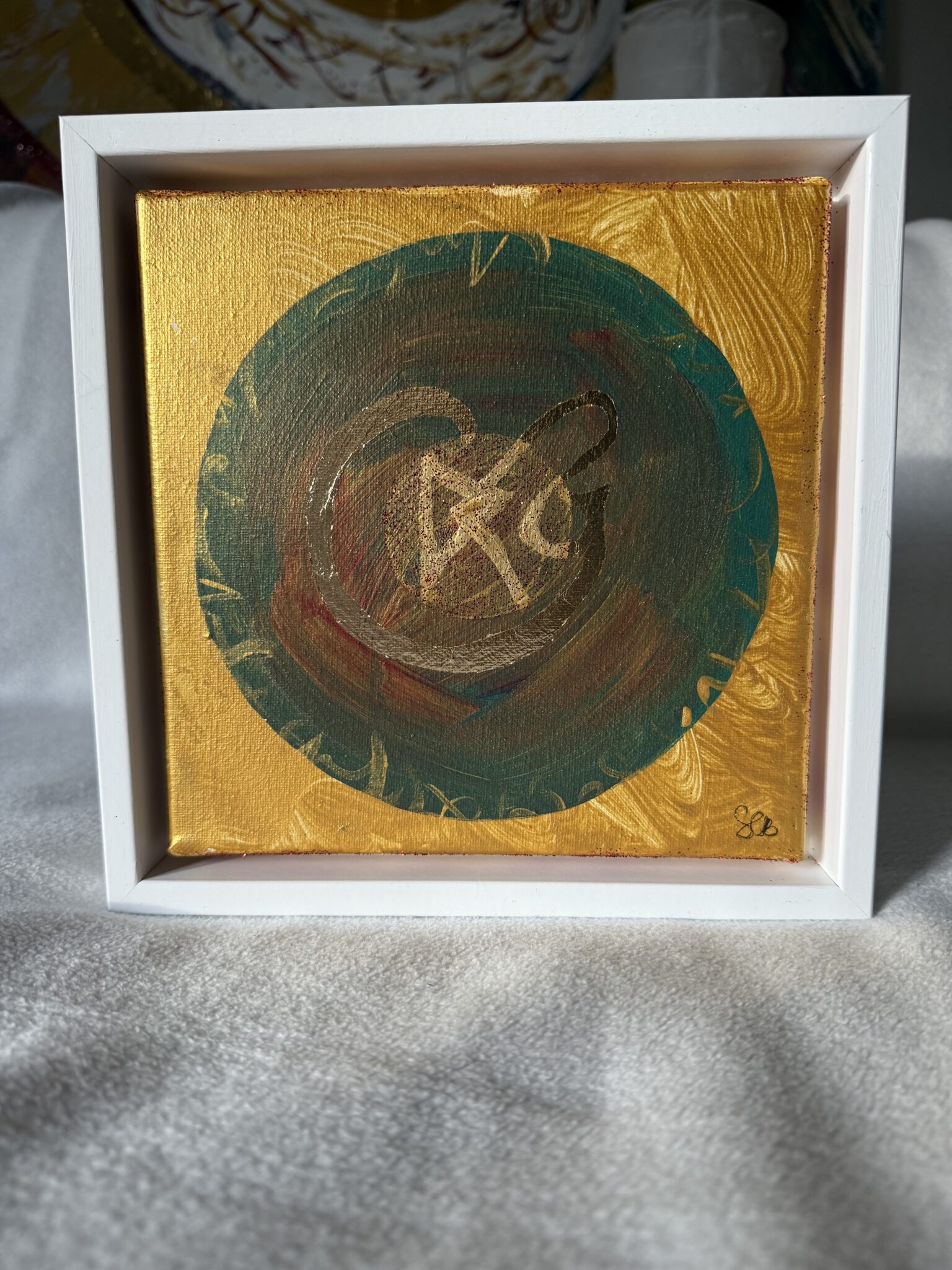 20 x 20 cm im Rahmen – Acryl & Strukturpaste auf Leinwand, veredelt mit Gold und Glitzer