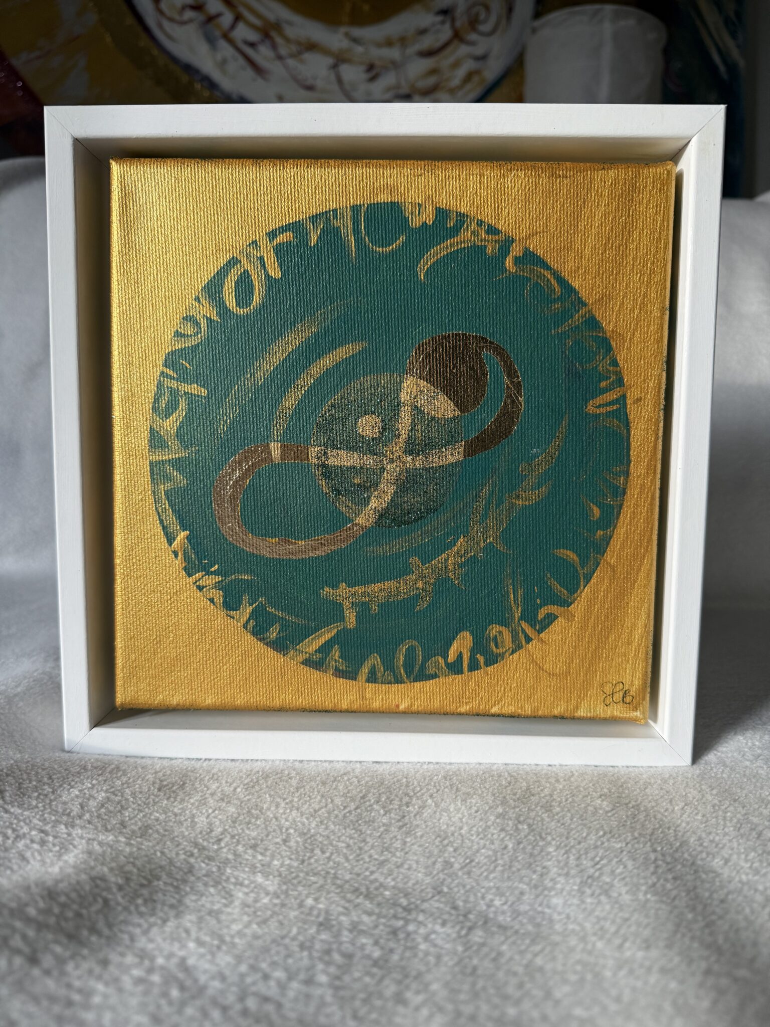 20 x 20 cm im Rahmen – Acryl & Strukturpaste auf Leinwand, veredelt mit Gold und Glitzer